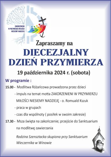 Rodzina Szensztacka skupiona przy Sanktuarium Wieczernika w Opolu-Winowie zaprasza na Diecezjalny Dzień Przymierza, który odbędzie się w sobotę 19 października w Opolu-Winowie. W programie m.in.: modlitwa różańcowa prowadzona przez dzieci, konferencja o. Romualda Kszuka nt. motta „Zakorzenieni w przymierzy miłości nieśmy nadzieję”, Msza św. i modlitwa zawierzenia w Sanktuarium.