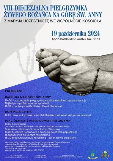 Ks. Mariusz Sobek, diecezjalny moderator Żywego Różańca, zaprasza na 8. Diecezjalną Pielgrzymkę Żywego Różańca, która odbędzie się w sobotę 19 października br. na Górze Świętej Anny. Towarzyszyć jej będzie motto: «Z Maryją uczestniczę we wspólnocie Kościoła». Rozpoczęcie o godz. 10.00, zakończenie ok. 15.30. W programie: Msza św. pod przewodnictwem biskupa Pawła Stobrawy, adoracja Najświętszego Sakramentu, okazja do spowiedzi, konferencja (którą wygłosi ks. Łukasz Szuster, diecezjalny duszpasterz Dzieci Maryi), modlitwa różańcowa z procesją do ołtarza papieskiego, spotkanie z Siostrami Loretankami z Warszawy. W czasie pielgrzymki będzie możliwość nabycia odznaki Żywego Różańca oraz publikacji książkowych Wydawnictwa Sióstr Loretanek, a w czasie przerwy będzie można zakupić lekki posiłek i napoje.