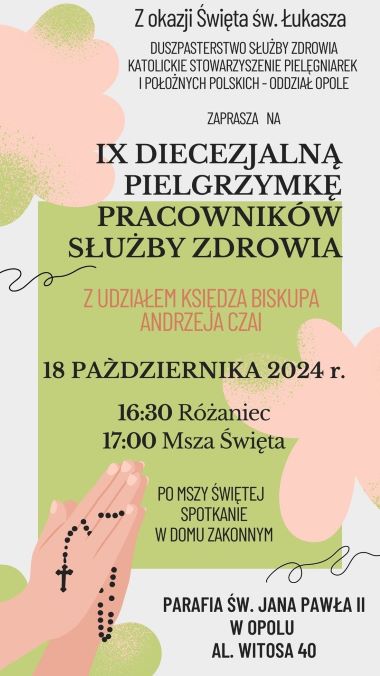 Diecezjalny duszpasterz służby zdrowia, ks. Piotr Bałos, oraz Opolski Oddział Katolickiego Stowarzyszenia Pielęgniarek i Położnych bardzo serdecznie zapraszają Pracowników Służby Zdrowia oraz kapelanów szpitali, domów pomocy społecznej i hospicjów na doroczną Diecezjalną Pielgrzymkę Pracowników Służby Zdrowia z okazji liturgicznego wspomnienia św. Łukasza. Pielgrzymka odbędzie się w piątek 18 października 2024 r. w kościele pw. św. Jana Pawła II w Opolu. Jej centralnym punktem będzie Msza św. sprawowana o godz. 17.00 pod przewodnictwem biskupa Andrzeja Czai. Eucharystię poprzedzi modlitwa różańcowa o godz. 16.30. Po Mszy odbędzie się spotkanie w Domu Parafialnym Ojców Oblatów.