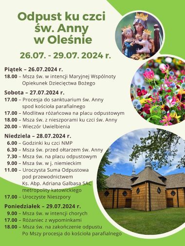 Duszpasterze parafii Bożego Ciała w Oleśnie zapraszają na uroczystości odpustowe ku czci św. Anny. Uroczystości rozpoczną się w piątek 26 lipca br. i potrwają do poniedziałku 29 lipca br.
