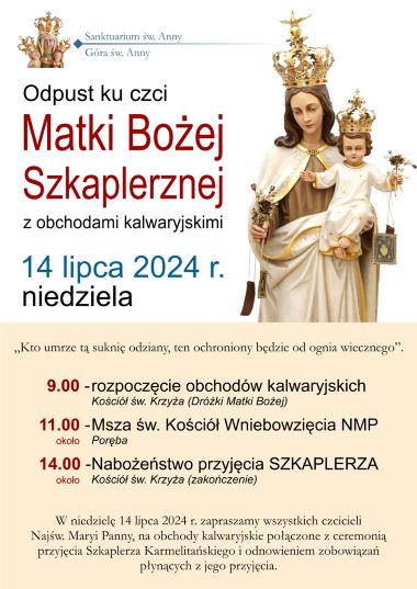 Ojcowie Franciszkanie z Góry św. Anny zapraszają czcicieli Matki Bożej z Góry Karmel na obchody kalwaryjskie (połączone z ceremonią nałożenia szkaplerza karmelitańskiego i odnowieniem zobowiązań płynących z jego przyjęcia), które odbędą się w niedzielę 14 lipca 2024 r. Rozpoczęcie obchodów (dróżki maryjne) o godz. 9.00 przy kościele pw. Krzyża Świętego na Kalwarii, ok. godz. 11.00 Msza św. w kościele pw. Wniebowzięcia NMP w Porębie, zakończenie ok. godz. 14.00 przy kościele pw. Krzyża Świętego. Szczególnymi gośćmi będą Ojcowie Karmelici Bosi z Wadowic.