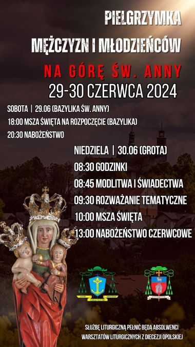 Biskup opolski Andrzej Czaja bardzo serdecznie zaprasza do udziału w Pielgrzymce Mężczyzn i Młodzieńców na Górę Świętej Anny, która odbędzie się w dniach 29-30 czerwca br. Obchody pielgrzymki rozpoczną się już w sobotę Mszą św. o godz. 18.00 i nabożeństwem o godz. 20.30 sprawowanymi w bazylice. W niedzielę od godz. 8.00 będzie możliwość skorzystania na Rajskim Placu z sakramentu pokuty i pojednania, a w Grocie Lurdzkiej o godz. 8.30 Godzinki, o godz. 8.45 modlitwa i świadectwa, o godz. 9.30 rozważania tematyczne. Centralnym punktem będzie Msza św. o godz. 10.00 pod przewodnictwem Księży Biskupów i z udziałem Księży Neoprezbiterów. Pielgrzymkę zakończy nabożeństwo czerwcowe o godz. 13.00. Służbę liturgiczną pełnić będą absolwenci Warsztatów Liturgicznych.