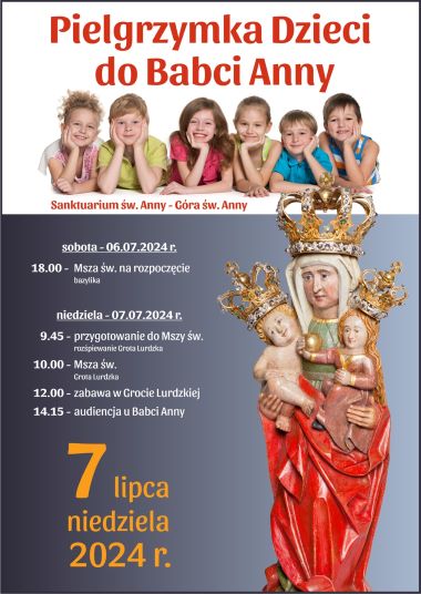 Biskup opolski Andrzej Czaja bardzo serdecznie zaprasza dzieci wraz z rodzicami na Pielgrzymkę Dzieci do Babci Anny, która odbędzie się w niedzielę 7 lipca 2024 r. na Górze Świętej Anny. Centralnym punktem będzie Msza św. sprawowana w Grocie Lurdzkiej o godz. 10.00, poprzedzona rozśpiewaniem o godz. 9.45. O godz. 12.00 rozpocznie się czas wspólnych gier i zabaw, a na godz. 14.15 zaplanowano wizytę w Bazylice na tzw. audiencji u św. Anny.