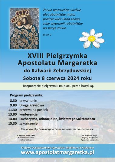 Bardzo serdecznie zapraszamy wszystkie osoby modlące się za kapłanów do udziału w VIII Pielgrzymce Apostolatu Margaretka do Kalwarii Zebrzydowskiej, która odbędzie się w sobotę 8 czerwca 2024 r. Spotkanie rozpocznie się o godz. 8.30 przed bazyliką w Kalwarii Zebrzydowskiej; o godz. 9.00 Nabożeństwo Drogi Krzyżowej na Kalwarii. Po przerwie, o godz. 13.00, zaplanowano konferencję formacyjną. Centralnym punktem pielgrzymki będzie Eucharystia o godz. 14.00, po której przewidziano adorację Najświętszego Sakramentu. Więcej informacji na stronie: www.apostolatmargaretka.pl.