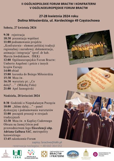W dniach 27-28 kwietnia 2024 r. (sobota-niedziela) w Dolinie Miłosierdzia w Częstochowie (ul. Kordeckiego 49) odbędzie się II Ogólnopolskie Forum Bractw i Konfraterni oraz V Ogólnoeuropejskie Forum Bractw. W programie: Msze św., nabożeństwa, wykłady, warsztaty i dyskusja.