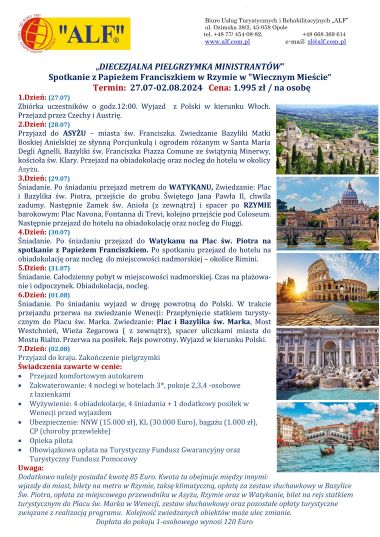 Diecezjalne Duszpasterstwo Liturgicznej Służby Ołtarza organizuje wyjazd do Włoch na spotkanie ministrantów i lektorów z całego świata z Papieżem Franciszkiem, które odbędzie się we wtorek 30 lipca br. na placu św. Piotra w Rzymie. Wyjazd zaplanowany jest jako kilkudniowa pielgrzymka po Włochach. Zapisy do 10 maja br. u ks. Dariusza Domereckiego, asystenta Diecezjalnego Duszpasterza LSO (tel. 666 175 403). Przy zapisach wymagana jest wpłata zaliczki w wysokości 1000 zł.