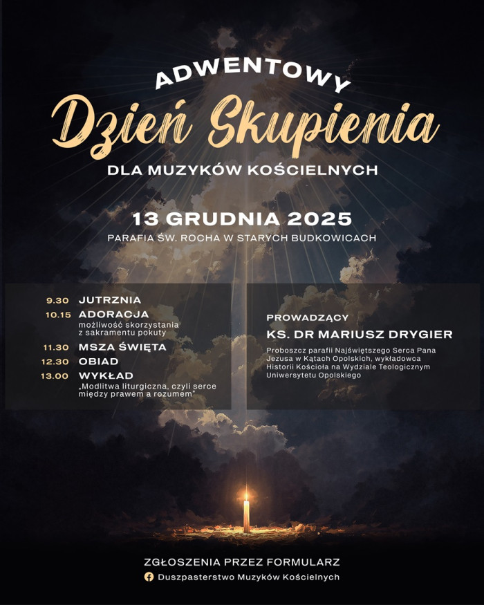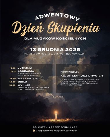 Duszpasterstwo Muzyków Kościelnych Diecezji Opolskiej zaprasza organistów, dyrygentów, chórzystów, kantorów, członków orkiestr i scholi na Adwentowy Dzień Skupienia, który odbędzie się w sobotę, 13 grudnia, w parafii św. Rocha w Starych Budkowicach.