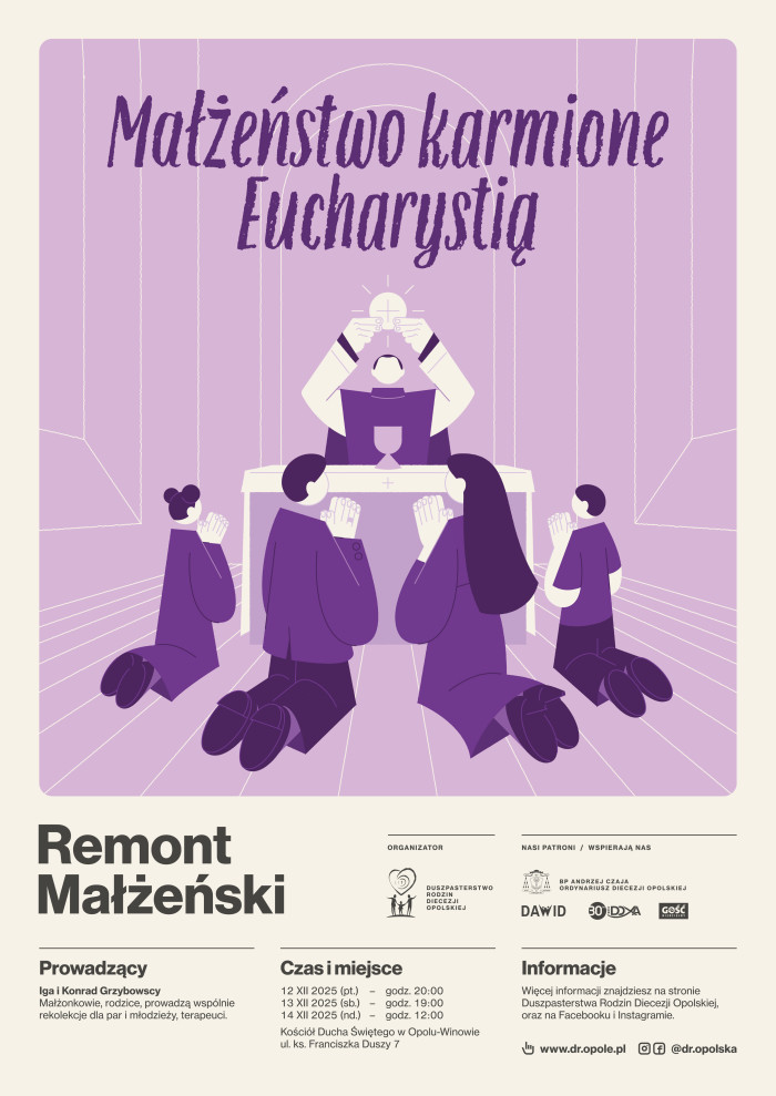 Duszpasterstwo Rodzin Diecezji Opolskiej zaprasza do udziału w kolejnej edycji „Remontu Małżeńskiego”. Tematyka tegorocznych rekolekcji będzie koncentrowała się na znaczeniu Eucharystii w życiu małżeńskim i rodzinnym oraz jej wpływie na budowanie jedności i wzajemnej relacji.