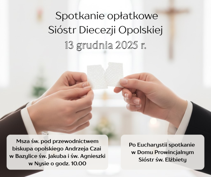 O. Błażej Kurowski OFM, wikariusz biskupi ds. życia konsekrowanego oraz s. Jolanta Radomyska SSpS, referentka ds. życia konsekrowanego, zapraszają Siostry Zakonne posługujące w diecezji opolskiej na spotkanie opłatkowe. Odbędzie się ono w sobotę, 13 grudnia w Nysie.