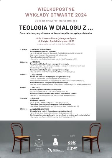Wydział Teologiczny Uniwersytetu Opolskiego oraz Muzeum Diecezjalne w Opole zapraszają na doroczne Wielkopostne Wykłady Otwarte. W tym roku, z okazji 30. rocznicy utworzenia Uniwersytetu Opolskiego i Wydziału Teologicznego, tematem wykładów będzie dialog teologii z innymi naukami. Wykłady przyjmą formę interdyscyplinarnej debaty w temacie aktualnych problemów i wyzwań, a dysputy odbędą się w formie dwugłosu, którego uczestnikami będą profesorowie opolskiej teologii i przedstawiciele innych nauk środowiska akademickiego miasta Opola. Pytania dotyczące problemów rozwijającej się techniki, wyzwań w sferze medycyny, w polityce, w obszarze ekologii, światopoglądu, a także w zakresie tendencji we współczesnej kulturze to zagadnienia ważne nie tylko dla przedstawicieli różnych dyscyplin naukowych, ale dotyczą także życia każdego człowieka i przyszłości ludzkości. Tegoroczne Wielkopostne Wykłady Otwarte mają na celu ukazanie, że w poszukiwaniu odpowiedzi na aktualne problemy i pytania dialog interdyscyplinarny jest możliwy i konieczny. Spojrzenie na te same problemy z różnych perspektyw stanowi wkład w poszukiwanie dróg budowy dobra wspólnego i świata opartego na współpracy i porozumieniu, zdolnego do rozwiązywania problemów i podejmowania wyzwań. Wykłady odbędą się w kolejne soboty Wielkiego Postu (pierwszy 17 lutego br.) w Auli Muzeum Diecezjalnego w Opolu (wejście od ul. Książąt Opolskich 44). Rozpoczęcie o godz. 16.30.