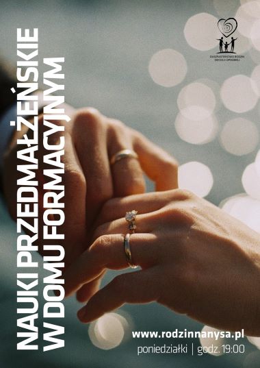 Duszpasterstwo Rodzin Rejonu Nyskiego zaprasza narzeczonych do udziału stacjonarnych naukach przedmałżeńskich. Najbliższy kurs (składający się z czterech poniedziałkowych wieczornych spotkań) rozpocznie się 4 marca 2024 r. o godz. 19.00 w Diecezjalnym Domu Formacyjnym w Nysie. Formularz zapisów oraz szczegółowe informacje można znaleźć na stronie: www.rodzinnanysa.pl.