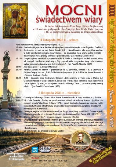 Diecezjalny duszpasterz kolejarzy, ks. Bartosz Radecki, serdecznie zaprasza kolejarzy wraz z rodzinami na 40. Ogólnopolską Pielgrzymkę Kolejarzy, która odbędzie się na Jasnej Górze w dniach 4-5 listopada br.