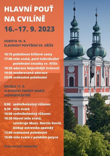 W niedzielę 17 września br. odbędzie się główny odpust ku czci Matki Bożej Bolesnej w sanktuarium na Cvilíně koło Krnova. Msze św. w języku czeskim będą sprawowane o godz. 8.30 i 10.30, zaś w języku polskim o godz. 15.00. Sumie odpustowej o godz. 10.30 przewodniczyć będzie biskup ostrawsko-opawski Martin David.