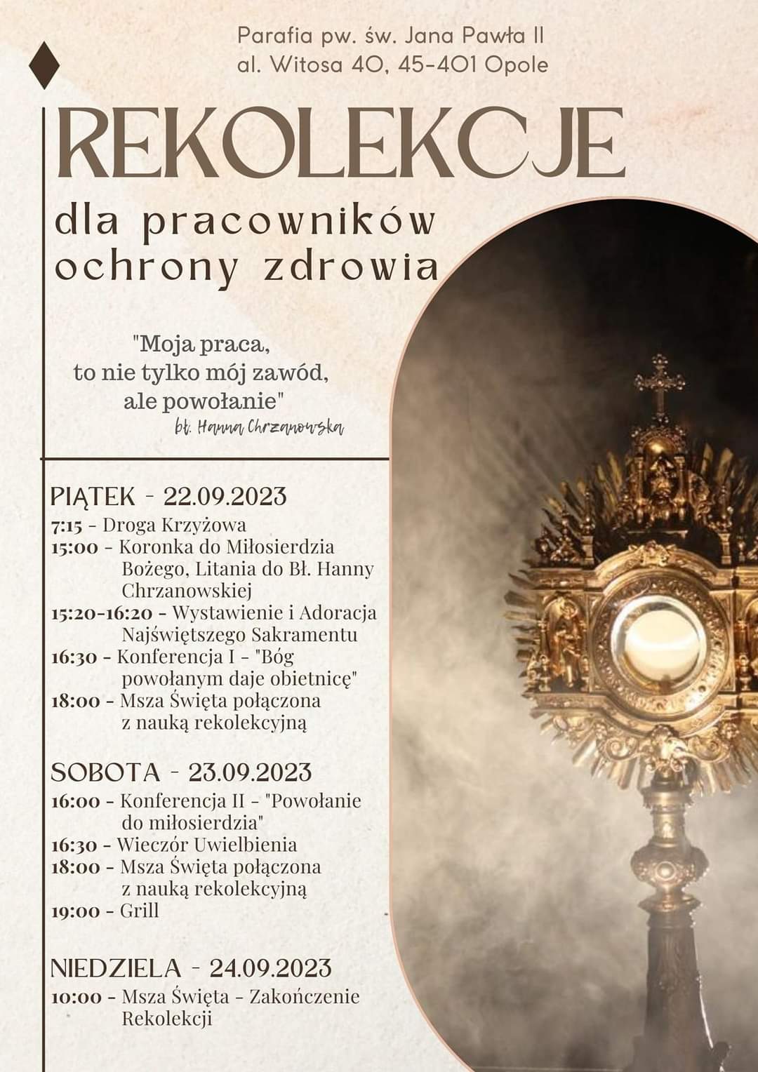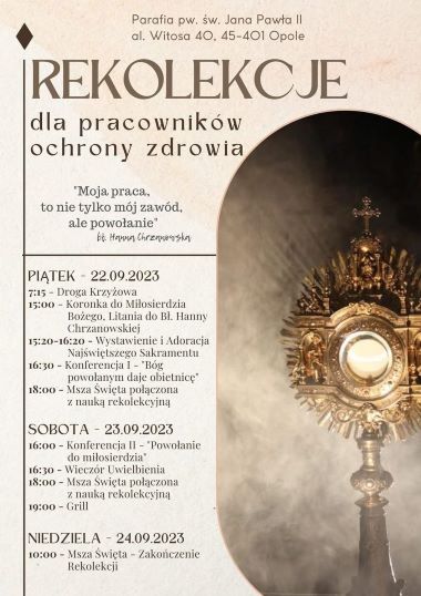 Ks. Piotr Bałos, diecezjalny duszpasterz Służby Zdrowia, zaprasza wszystkie osoby związane z ochroną zdrowia do udziału w rekolekcjach, które odbędą się w dniach 22-24 września br. w parafii św. Jana Pawła II w Opolu. W programie m.in. Msze z naukami rekolekcyjnymi, konferencje formacyjne, nabożeństwo Drogi Krzyżowej, Koronka do Miłosierdzia Bożego, litania ku czci bł. Hanny Chrzanowskiej, adoracja Najświętszego Sakramentu oraz okazja do spotkania braterskiego. Rekolekcje poprowadzi o. Sebastian Wiśniewski OMI.