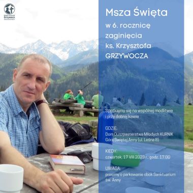 W czwartek 17 sierpnia 2023 r. o godz. 17.00 w Domu Duszpasterstwa Młodych „Kurnik” na Górze Świętej Anny (ul. Leśna 8) zostanie odprawiona Msza św. w intencji ks. Krzysztofa Grzywocza w 6. rocznicę jego zaginięcia. Po Eucharystii odbędzie się spotkanie przy kawie.