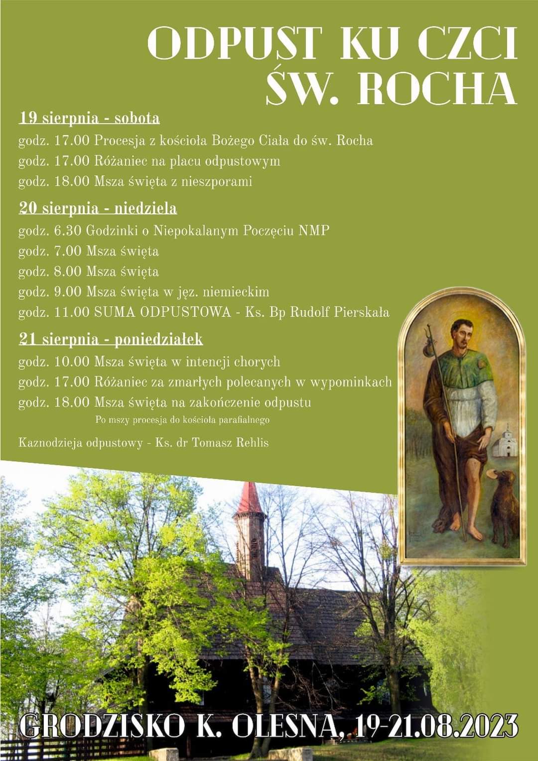 Duszpasterze parafii Bożego Ciała w Oleśnie zapraszają w dniach 19-21 sierpnia br. na uroczystości odpustowe ku czci św. Rocha w Grodzisku koło Olesna. Centralnym punktem będzie suma odpustowa pod przewodnictwem biskupa Rudolfa Pierskały w niedzielę 21 sierpnia o 11.00.