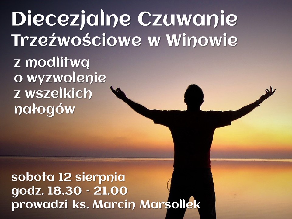 Diecezjalny duszpasterz trzeźwości, ks. Marcin Marsollek, serdecznie zaprasza na diecezjalne czuwanie trzeźwościowe, które odbędzie się w sobotę 12 sierpnia br. w parafii Ducha Świętego w Opolu-Winowie. Czuwanie rozpocznie Eucharystia o godz. 18.30, a po niej odbędzie się (do godz. 21.00) adoracja Najświętszego Sakramentu z prośbą o dar trzeźwego życia.