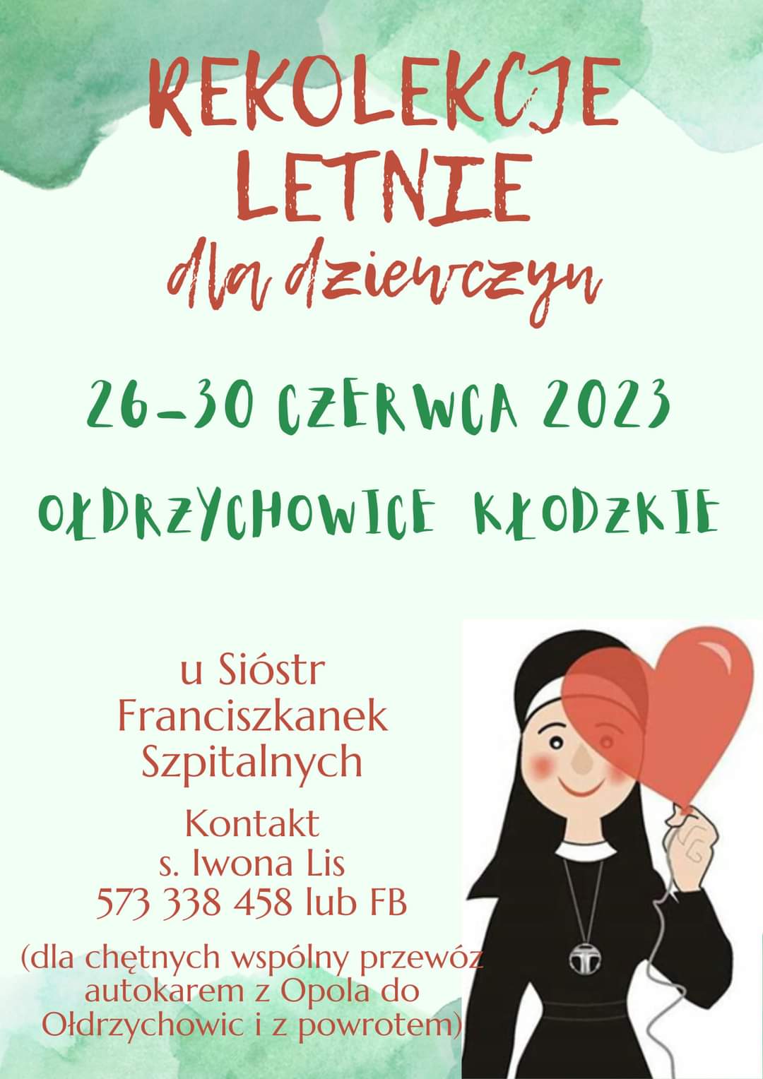 Siostry Franciszkanki Szpitalne zapraszają dziewczęta w wieku 14-25 lat do udziału w rekolekcjach, które odbędą się w Ołdrzychowicach Kłodzkich od poniedziałku 26 czerwca (możliwość wspólnego wyjazdu z Opola) do piątku 30 czerwca br. (możliwość powrotu do Opola autokarem). W programie każdego dnia: Msza św. z kazaniem, dwie konferencje, adoracja Najświętszego Sakramentu z możliwością spowiedzi lub rozmowy z kapłanem, koronka, modlitwa brewiarzowa, prace w grupach, wspólne posiłki i pogodne wieczory. Zaplanowane jest także wyjście w góry i ognisko. Zapisy oraz szczegółowe informacje u s. Iwony Lis (tel. 573 338 458 lub przez profil Facebook).