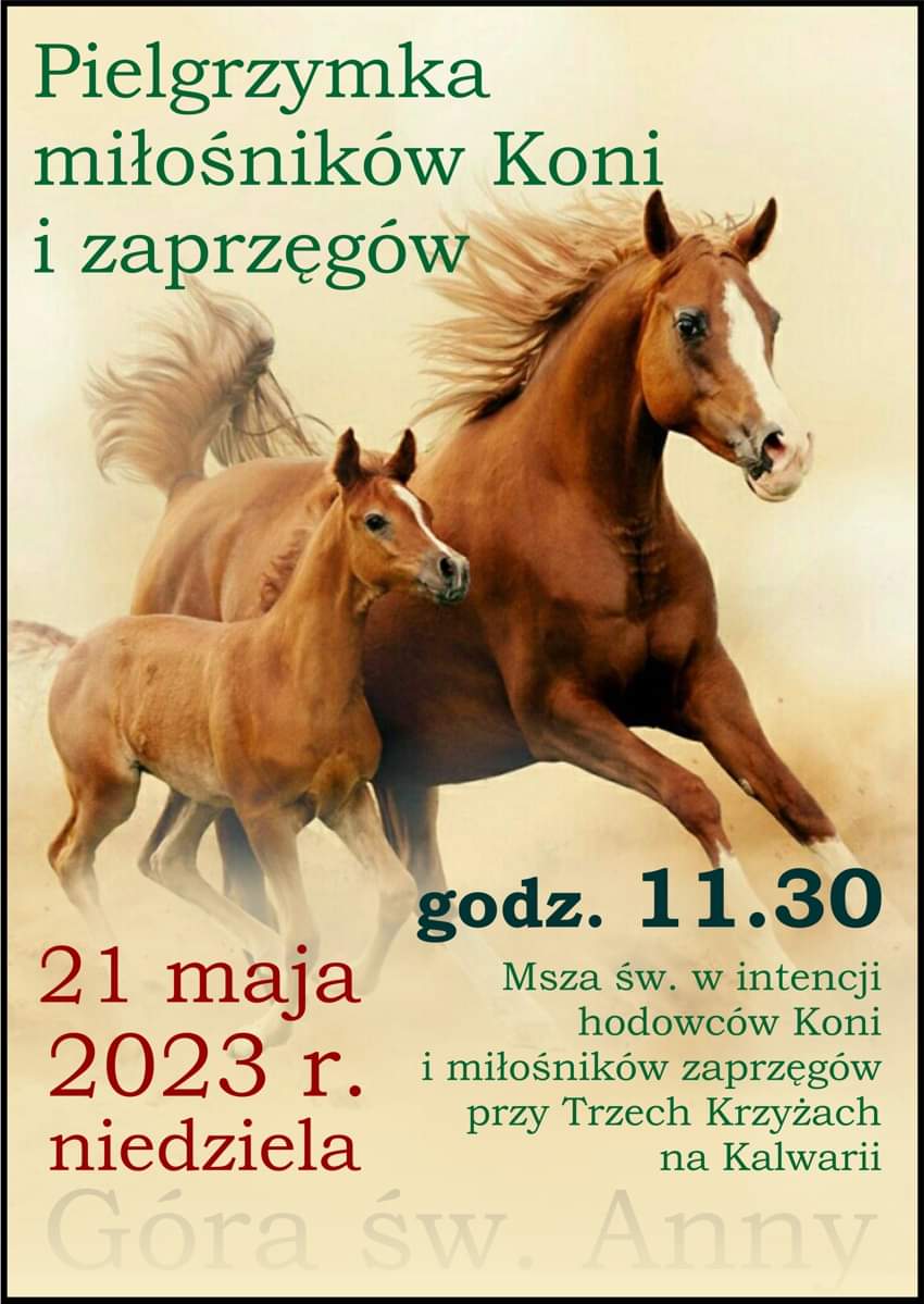 Ojcowie Franciszkanie z Góry Świętej Anny bardzo serdecznie zapraszają do udziału w dorocznej Pielgrzymce Miłośników Koni i Zaprzęgów, która odbędzie się w niedzielę 21 maja br. Rozpoczęcie o godz. 11.30 Mszą św. przy Trzech Krzyżach na Kalwarii.