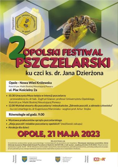 Ks. Rafał Pawliczek, diecezjalny duszpasterz pszczelarzy, bardzo serdecznie zaprasza do udziału we Mszy św. sprawowanej w intencji pszczelarzy, która odbędzie się w niedzielę 21 maja br. o godz. 10.30 w kościele pw. Matki Boskiej Nieustającej Pomocy w Opolu-Nowej Wsi Królewskiej. Eucharystii przewodniczyć będzie i Słowo Boże wygłosi ks. prof. Zygfryd Glaeser. Ponadto, przy kościele odbędzie się 2. Opolski Festiwal Pszczelarski dedykowany pamięci ks. dr. Jana Dzierżona.