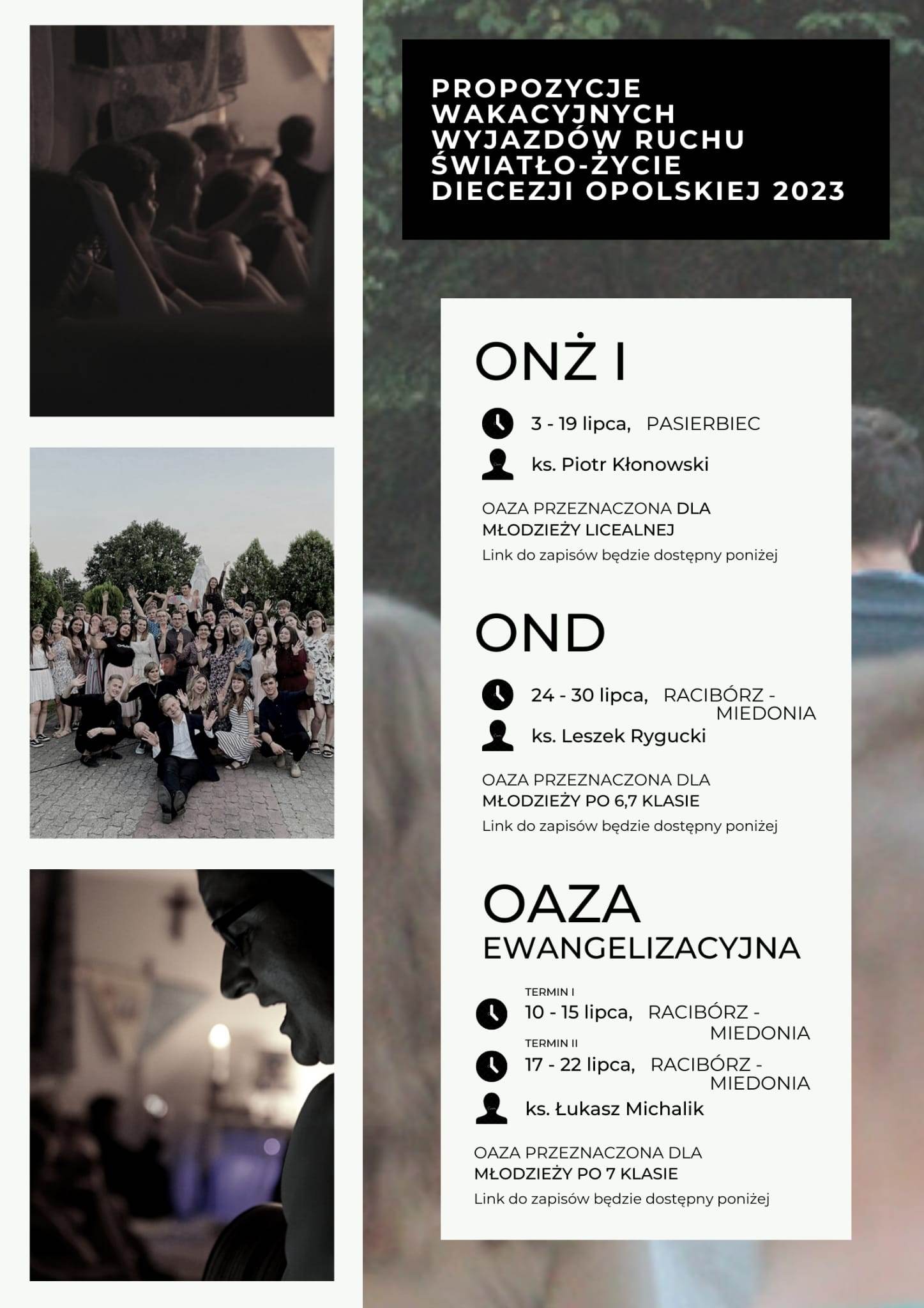 • Oaza Nowego Życia (dla młodzieży ze szkoły średniej), termin: 3-19 lipca 2023 r., prowadzący: ks. Piotr Kłonowski;