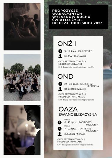 • Oaza Ewangelizacyjna (dla młodzieży od 8 klasy szkoły podstawowej), termin: 10-15 lipca 2023 r., prowadzący: ks. Łukasz Michalik;