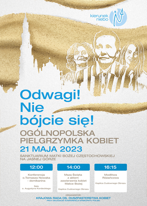 Krajowa Rada ds. Duszpasterstwa Kobiet serdecznie zaprasza wszystkie kobiety na 4. Ogólnopolską Pielgrzymkę Kobiet na Jasną Górę, która odbędzie się w niedzielę 21 maja br. Program spotkania jest następujący: o godz. 12.00 modlitwa, wprowadzenie i trzy wystąpienia (sala o. Augustyna Kordeckiego); godz. 14.00  Msza św. koncelebrowana pod przewodnictwem bpa Wiesława Szlachetki z aktem zawierzenia kobiet Matce Bożej (Kaplica Cudownego Obrazu); godz. 16.15 modlitwa różańcowa.