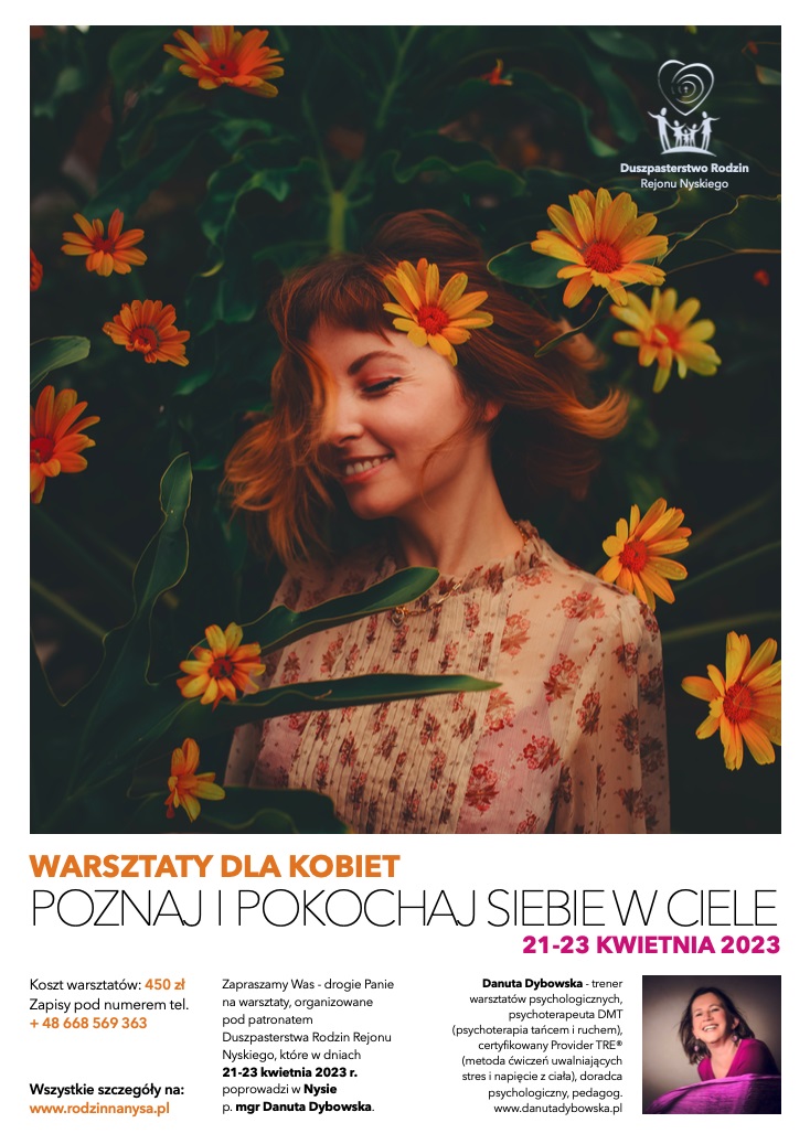 Duszpasterstwo Rodzin Rejonu Nyskiego zaprasza na warsztaty dla kobiet, którym towarzyszyć będzie hasło: „poznaj i pokochaj siebie w ciele”. Warsztaty, które odbędą się w dniach 21-23 kwietnia 2023 r. w Nysie, poprowadzi Danuta Dybowska, psychoterapeuta DMT (terapia ruchem i tańcem), specjalistka w pracy terapeutycznej z kobietami. Zapisy pod numerem telefonu 668 569 363.