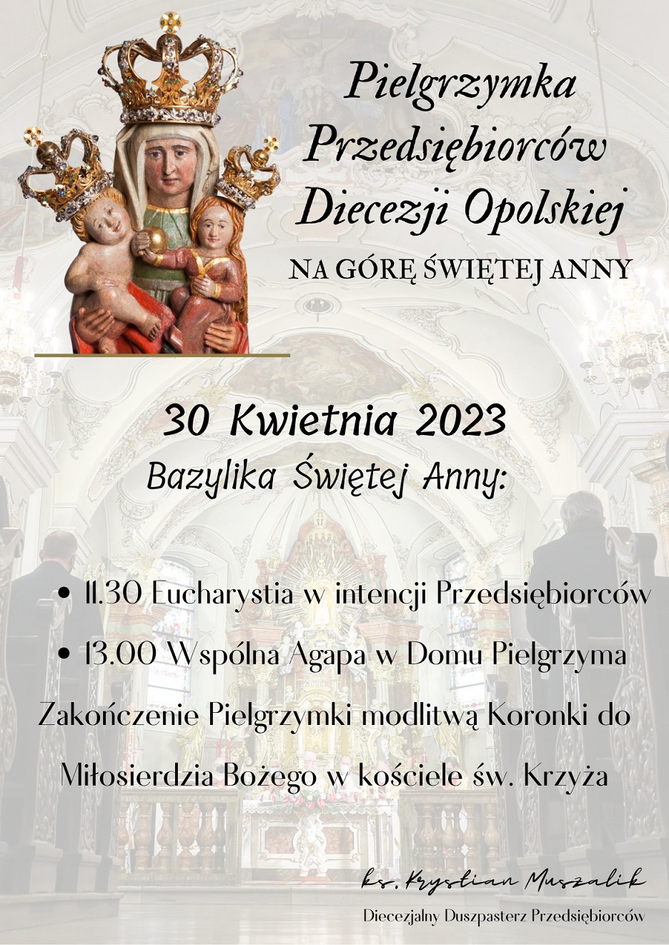 Diecezjalny duszpasterz przedsiębiorców, ks. Krystian Muszalik, zaprasza na doroczną pielgrzymkę przedsiębiorców, która odbędzie się w niedzielę 30 kwietnia br. na Górze św. Anny. O godz. 11.30 będzie sprawowana Eucharystia w intencji przedsiębiorców, a następnie wspólna agapa w Domu Pielgrzyma; zakończenie Koronką do Bożego Miłosierdzia w kościele pw. Świętego Krzyża.