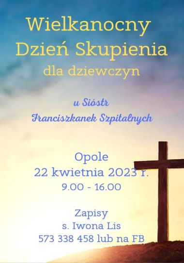 Siostry Franciszkanki Szpitalne zapraszają dziewczęta (od lat 13) na Wielkanocny Dzień Skupienia, który odbędzie się 22 kwietnia br. w klasztorze sióstr w Opolu (ul. Prószkowska 72). Rozpoczęcie o 9.00, zakończenie ok. 16.00.