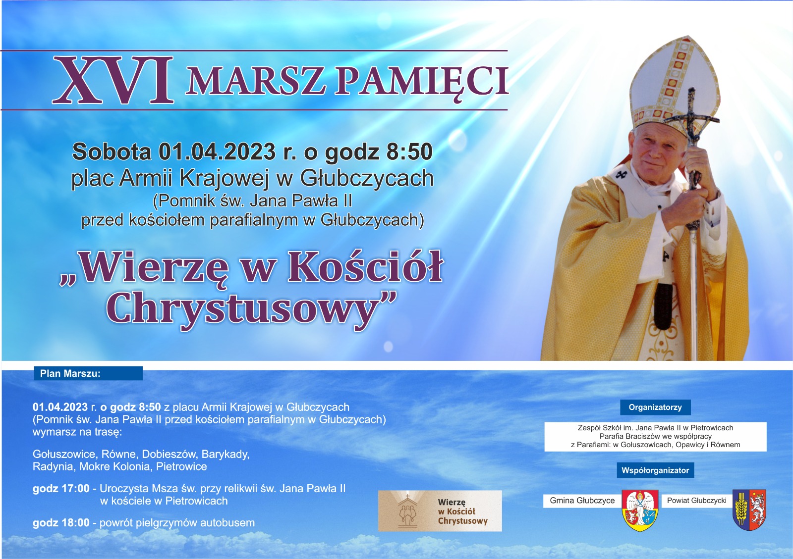 Zespół Szkół im. Jana Pawła II w Pietrowicach Głubczyckich i parafia w Braciszowie, przy współpracy z parafiami w Gołuszowicach, Równym i Opawicach, serdecznie zapraszają wszystkich chętnych do udziału w „XVI Marszu Pamięci” pod hasłem „Wierzę w Kościół Chrystusowy”, który odbędzie się w sobotę 1 kwietnia 2023 r., w rocznicę śmierci św. Jana Pawła II. Trasa przemarszu rozpoczyna się w Głubczycach i wiedzie przez miejscowości: Gołuszowice, Równe, Dobieszów, Radynia, Mokre-Kolonia, Pietrowice. Zakończenie pielgrzymki nastąpi o godz. 17.00 w kościele w Pietrowicach uroczystą Mszą św. przy relikwii św. Jana Pawła II. Współorganizatorami XVI Marszu Pamięci jest Gmina Głubczyce i Powiat Głubczycki.