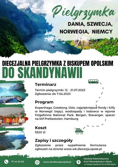 Pragniemy zaprosić na Diecezjalną Pielgrzymkę do Skandynawii (Dnia, Szwecja, Norwegia, klify i fiordy) w dniach 12 – 21.07.2023 r. z Biskupem Opolskim Andrzejem Czają.