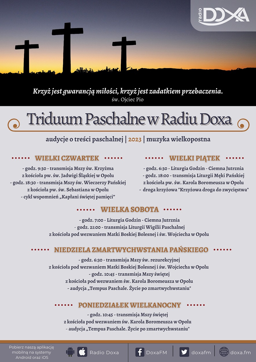 Zespół Diecezjalnego Radia Doxa przygotował bogatą ofertę programów i transmisji liturgii w czasie Triduum Paschalnego. Szczegółowy program jest dostępny na plakacie.