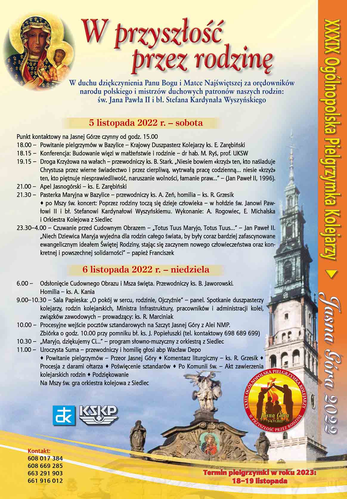 Diecezjalny duszpasterz kolejarzy, ks. Bartosz Radecki, serdecznie zaprasza kolejarzy wraz z rodzinami na 39. Ogólnopolską Pielgrzymkę Kolejarzy, która odbędzie się na Jasnej Górze w dniach 5-6 listopada br.