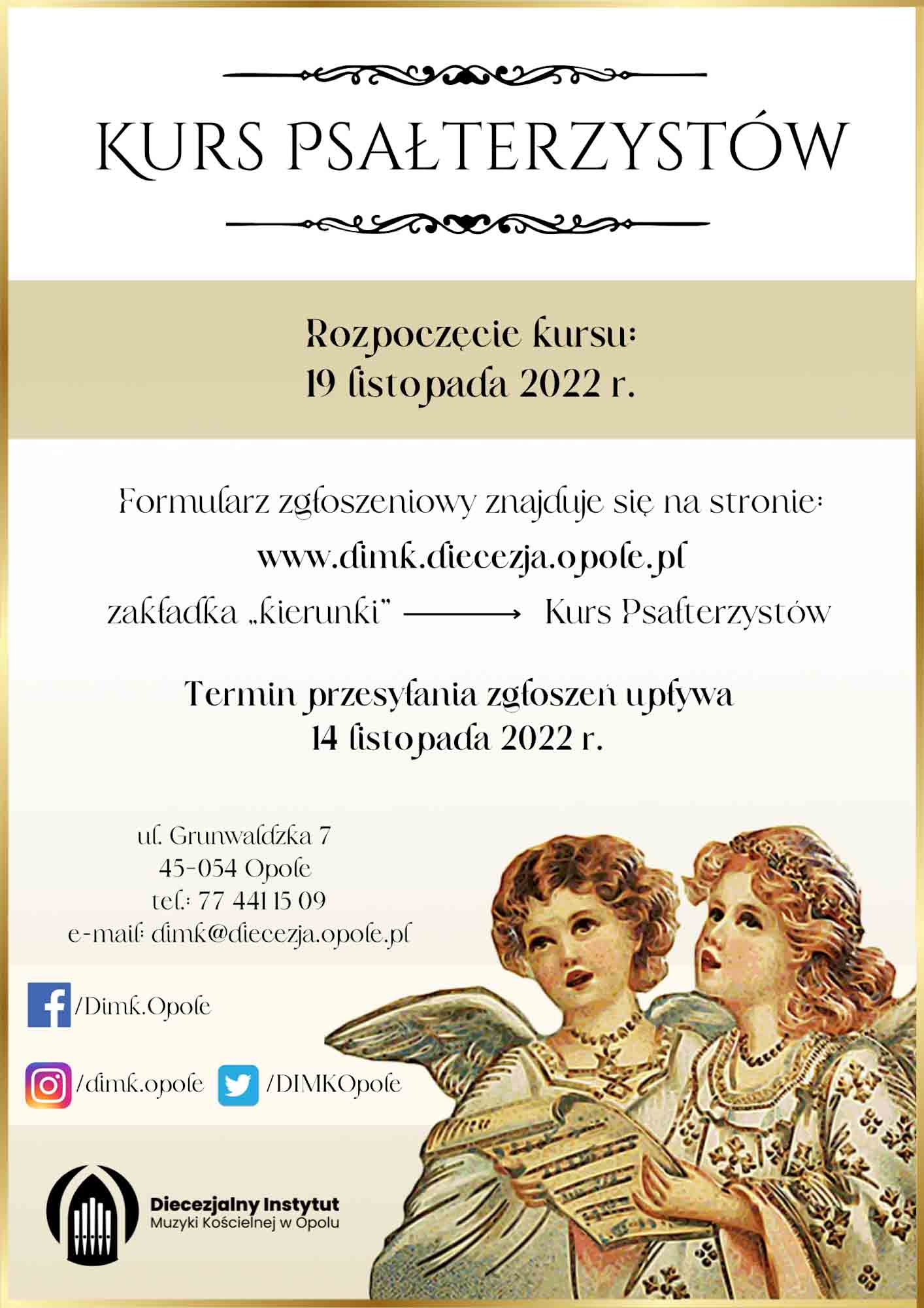Diecezjalny Instytut Muzyki Kościelnej w Opolu zaprasza osoby świeckie i konsekrowane do udziału w Kursie Psałterzystów, którego celem jest kompetentne przygotowanie muzyczne oraz formacja osób wykonujących psalmy responsoryjne podczas Eucharystii. Formularz zgłoszeniowy, terminarz spotkań oraz inne szczegółowe infromacje dostępne są na stronie internetowej: www.dimk.diecezja.opole.pl. Termin nadsyłania zgłoszeń upływa 14 listopada 2022 r.