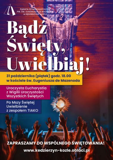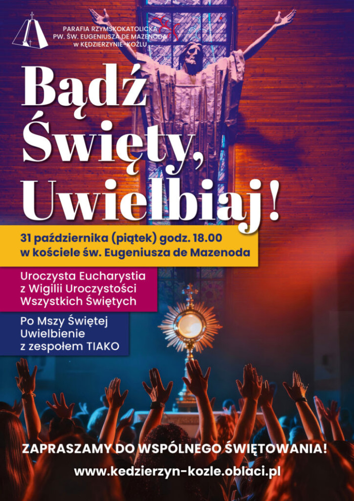 Ojcowie Oblaci z Kędzierzyna-Koźla zapraszają na uroczystą Eucharystię w wigilię Uroczystości Wszystkich Świętych oraz na Wieczór uwielbienia prowadzony przez Zespół TIAKO, które odbędą się w piątek, 31 października, w kościele pw. św. Eugeniusza de Mazenoda w Kędzierzynie-Koźlu (Pogorzelec). Rozpoczęcie o godz. 18.00.