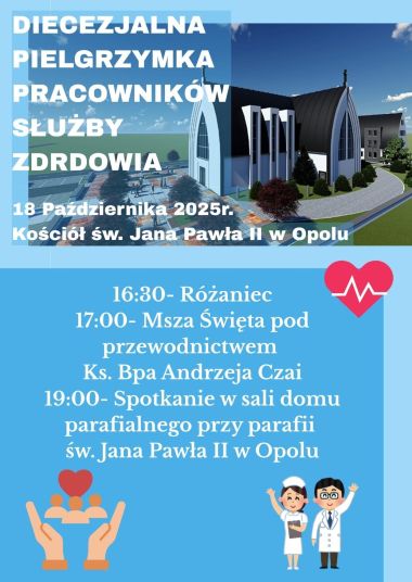 Diecezjalny Duszpasterz Służby Zdrowia, ks. Piotr Bałos, zaprasza Pracowników Służby Zdrowia oraz kapelanów szpitali, domów pomocy społecznej i hospicjów na doroczną Diecezjalną Pielgrzymkę Pracowników Służby Zdrowia z okazji liturgicznego wspomnienia św. Łukasza. Pielgrzymka odbędzie się w sobotę, 18 października, w parafii św. Jana Pawła II w Opolu.
