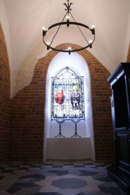Późniejsze zwieńczenia ścian i sklepienia kaplicy pozostawiono w tynku, by uwidocznić zasięg górnej krawędzi ścian romańskich oraz procesy związane z przebudową i podniesieniem sklepienia. Na ścianie zachodniej został uwidoczniony fragment gotyckiej łaty tynkowej z nasiekami.