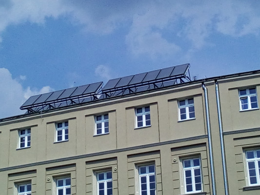 z wymiennika cieplnego , dodatkowo wspomaganie instalacja solarna montaż 24 kolektorów słonecznych o pow. 30 m2 i o mocy 22,78 kW - 1 kpl. - Modernizacja systemu grzewczego - zmieniamy źródło na ciepło z miejskiej sieci , modernizacja wymiennika ciepłą w węźle cieplnym - 1 kpl.
